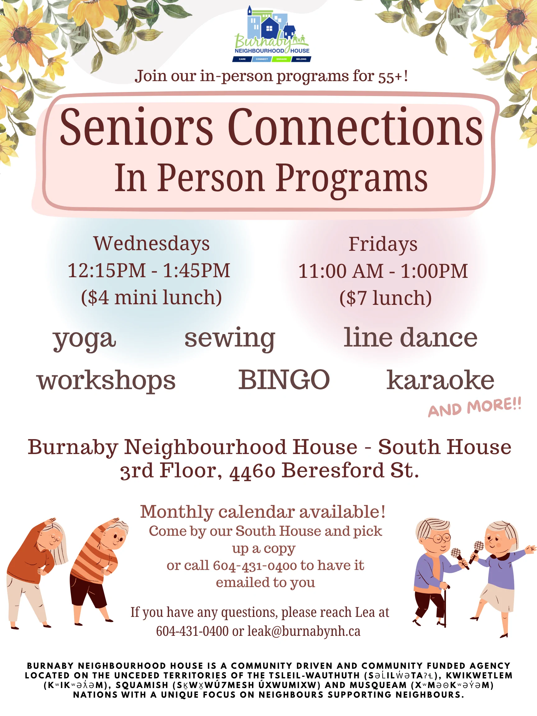 To register: Contact Lea at 604-431-0400 or leak@burnabynh.ca.