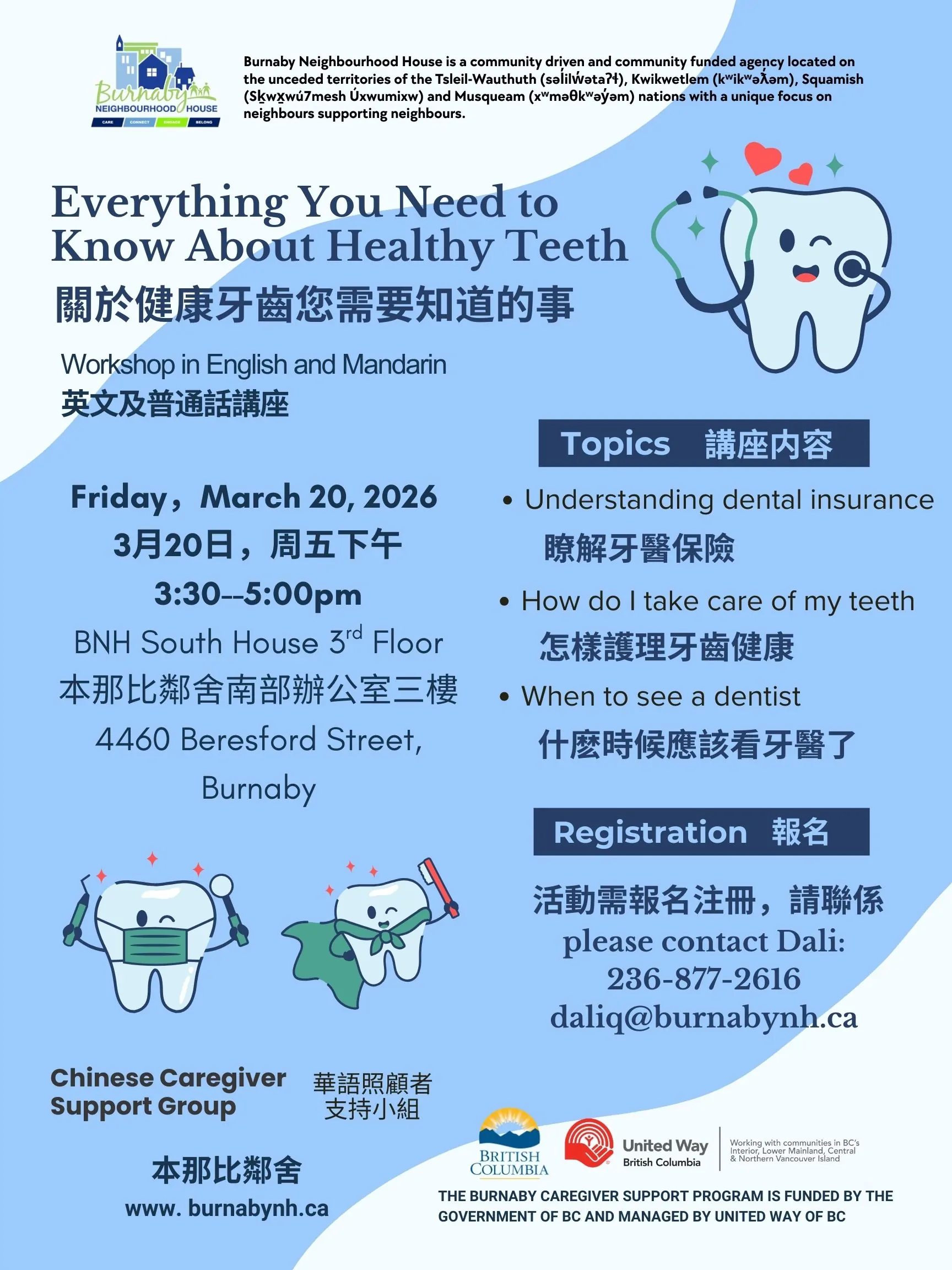 Come and join the Burnaby Neighbourhood House and the Chinese Caregiver Support Group for a bilingual dental health workshop on Friday, March 20, 2026, from 3:30PM to 5:00PM at the BNH South House, 3rd Floor (4460 Beresford Street, Burnaby). Presented in both English and Mandarin, this session will cover essential topics such as navigating dental insurance, daily hygiene tips, and knowing when to visit the dentist.