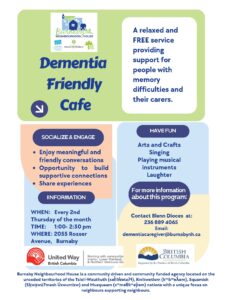 More than 85,000 people are currently living with dementia in this province. By 2050, that figure will triple. As part of the City of Burnaby’s Dementia Friendly Community Action Plan, Burnaby Seniors Outreach developed dementia programs in 2018. Programs include a monthly Dementia Friendly Cafe for people living with dementia and their caregivers and loved ones. Sessions include socialization and connection as well as informative workshops on various dementia and health-related topics. A weekly Seniors Memory Club is also offered as a social club for people living with memory loss and their loved ones to gather, sing, laugh, exercise, and have fun!