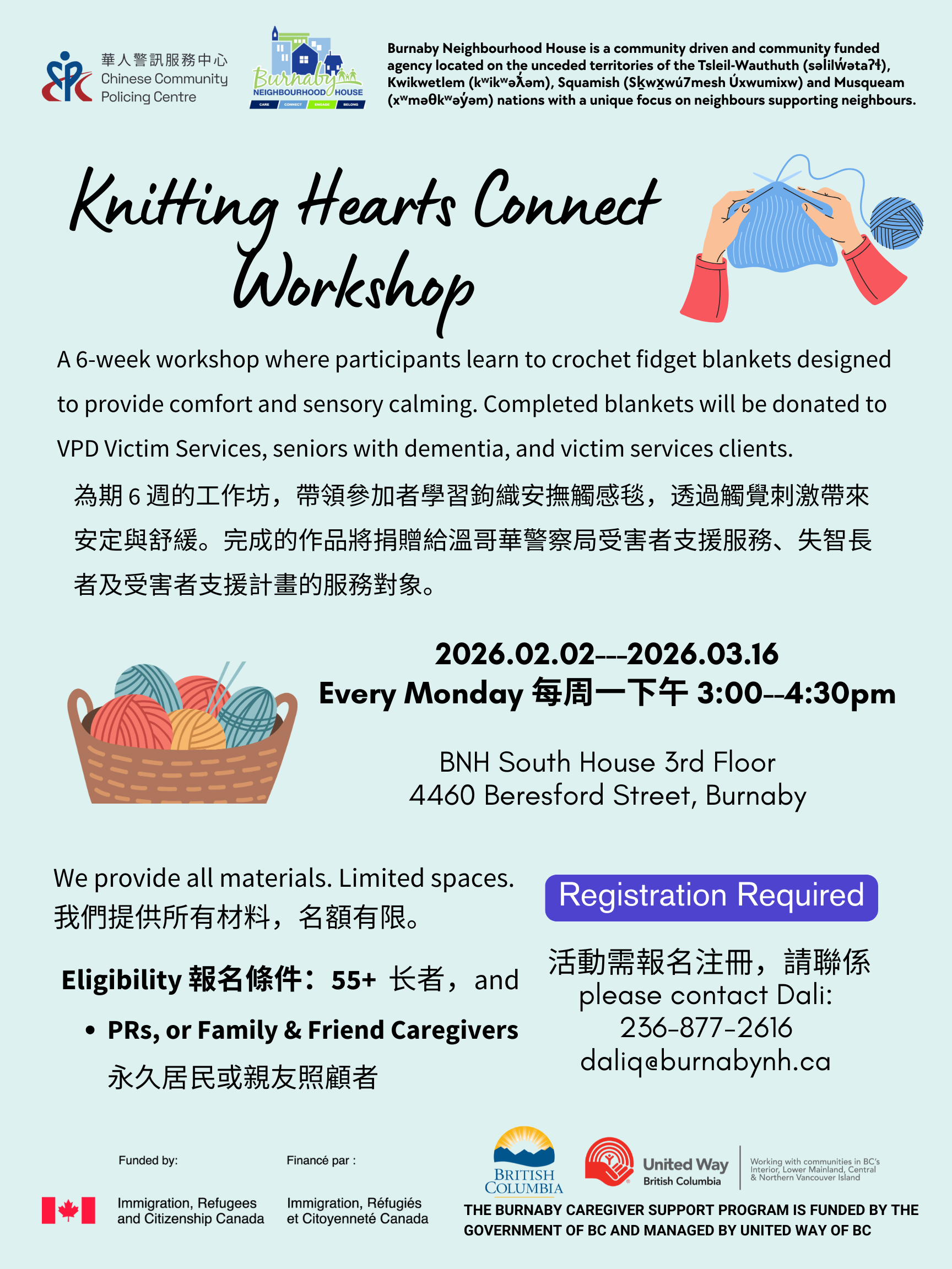 Create comfort, connection, and community in our 6-week Knitting Heart Connect Workshop, where participants crochet fidget blankets that provide sensory calming and care. Completed blankets will be donated to VPD Victim Services, seniors with dementia, and victim services clients. This program is hosted on Mondays and is open to participants aged 55+ who are PR or Family & Friend Caregivers.