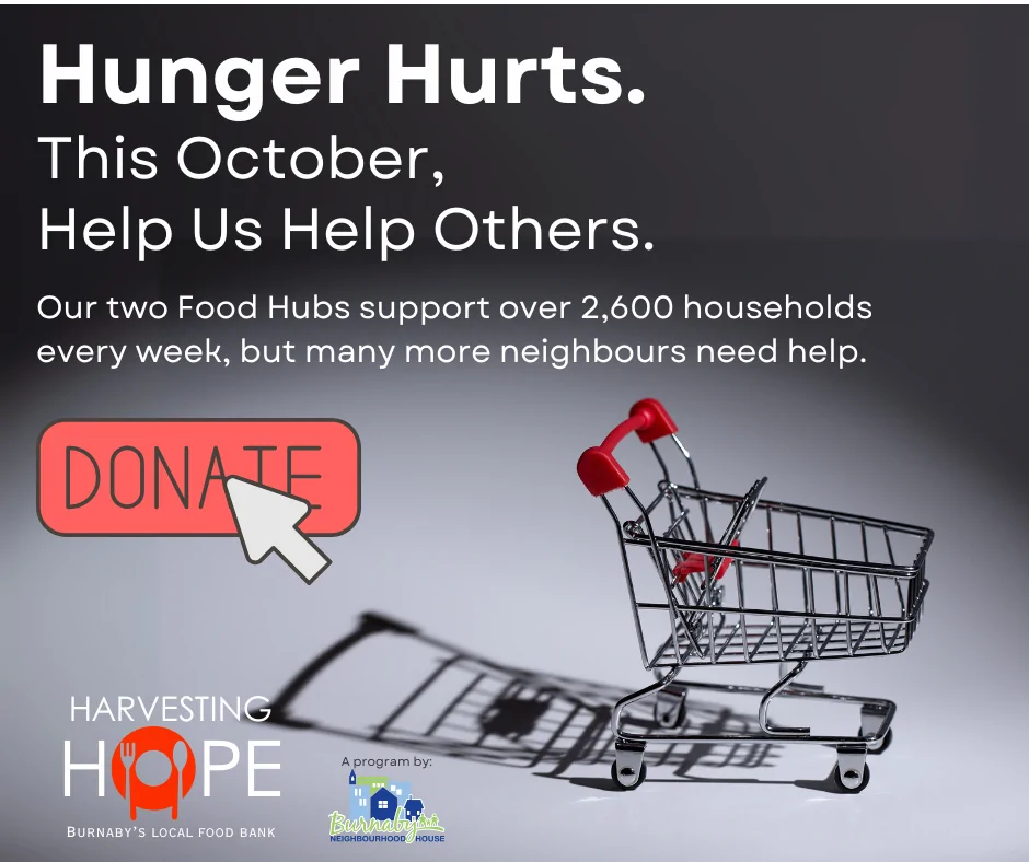 In October, Burnaby Neighbourhood House (BNH) is once again organizing the Harvesting Hope campaign aimed at raising funds for its two Food Hubs serving the Burnaby community. BNH operates two Food Hubs – one in North Burnaby Neighbourhood House at 4908 Hastings Street, and one at South Burnaby’s Community Hall at 5024 Rumble Street.
