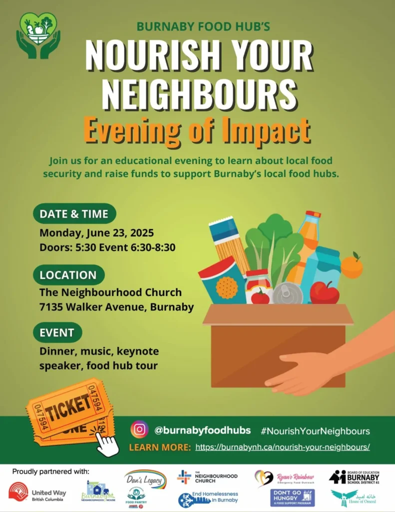 Thank you for supporting Burnaby Food Hubs’ Nourish Your Neighbours: Evening of Impact. This community event will help raise funds towards the infrastructure of Burnaby’s local food hubs.