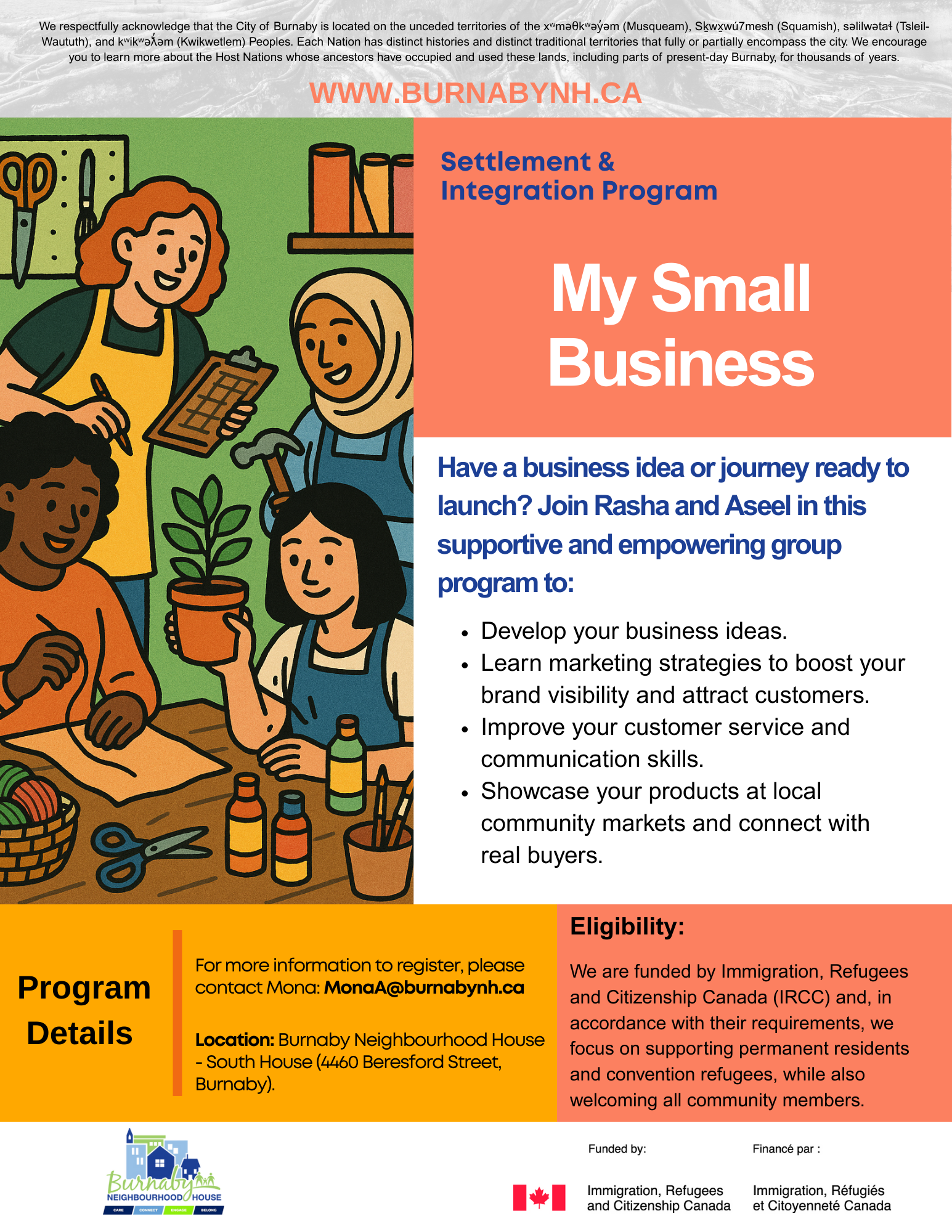 Burnaby Neighbourhood House is a community driven and community funded agency located on the unceded territories of the Tsleil-Wauthuth (səl̓ilw̓ətaʔɬ), Kwikwetlem (kʷikʷəƛ̓əm), Squamish (Sḵwx̱wú7mesh Úxwumixw) and Musqueam (xʷməθkʷəy̓əm) nations with a unique focus on neighbours supporting neighbours.