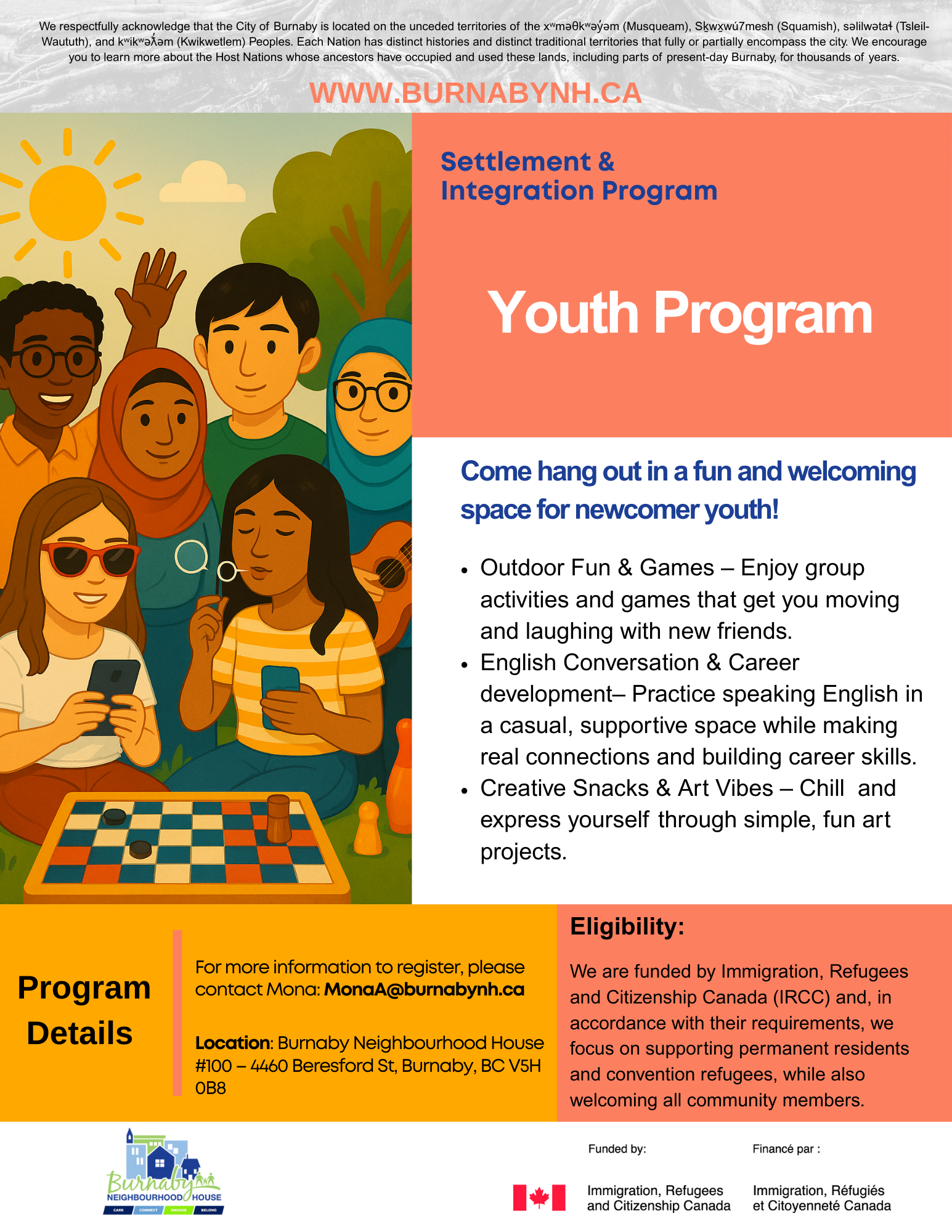 Are you a newcomer youth between the ages of 15 and 35? Join us in a fun and welcoming space to enjoy outdoor games, practice English, build career skills, and express yourself through creative art activities. It’s a great way to meet new people, connect, and grow in a supportive environment.