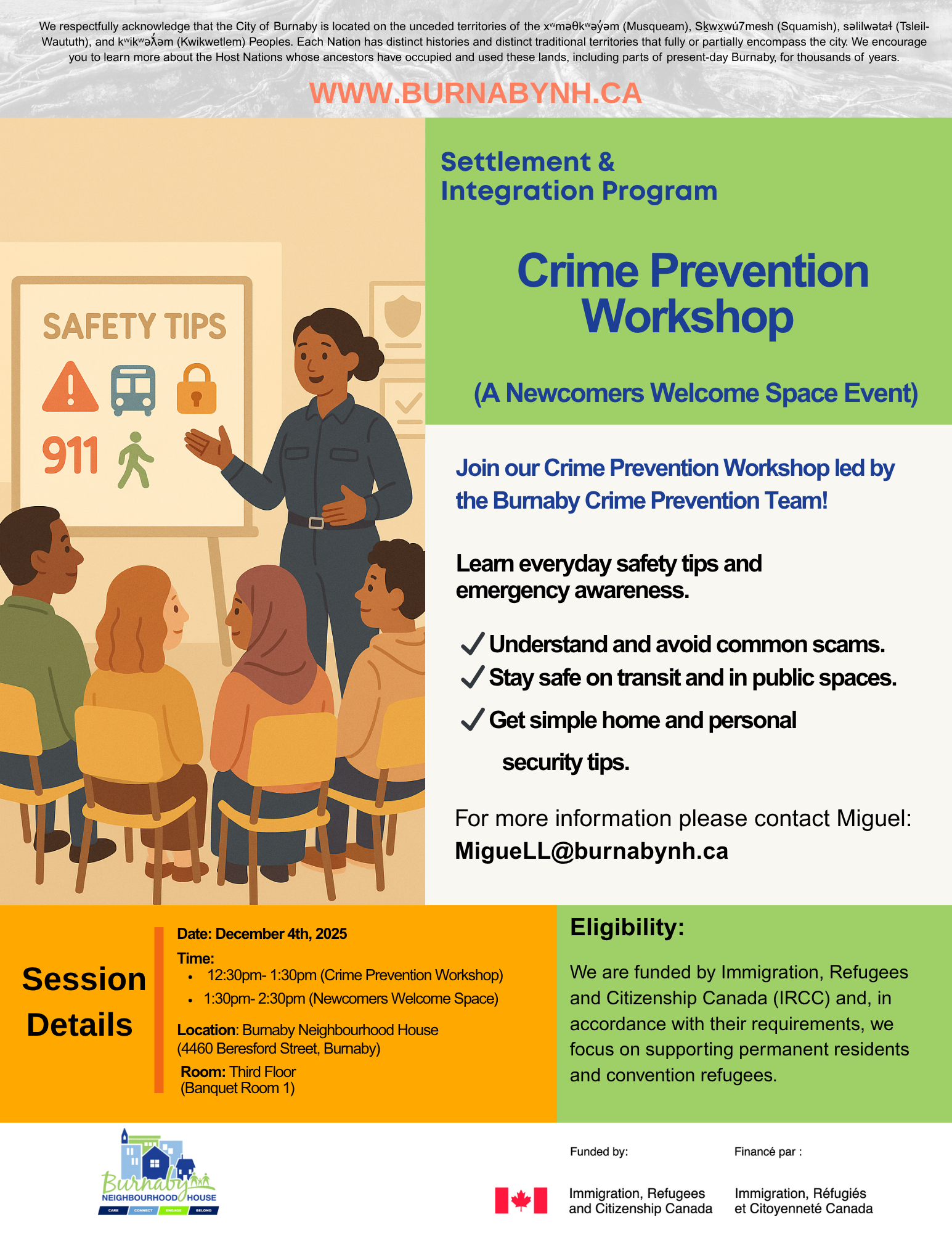 Join our Crime Prevention Workshop at BNH South House, led by the Burnaby Crime Prevention Team. Learn everyday safety tips and boost your emergency awareness, including how to avoid common scams, stay safe on transit and in public spaces, and get simple home and personal security tips. The workshop is on December 4, 2025, from 12:30 PM to 1:30 PM, followed by the Newcomers Welcome Space from 1:30 PM to 2:30 PM.