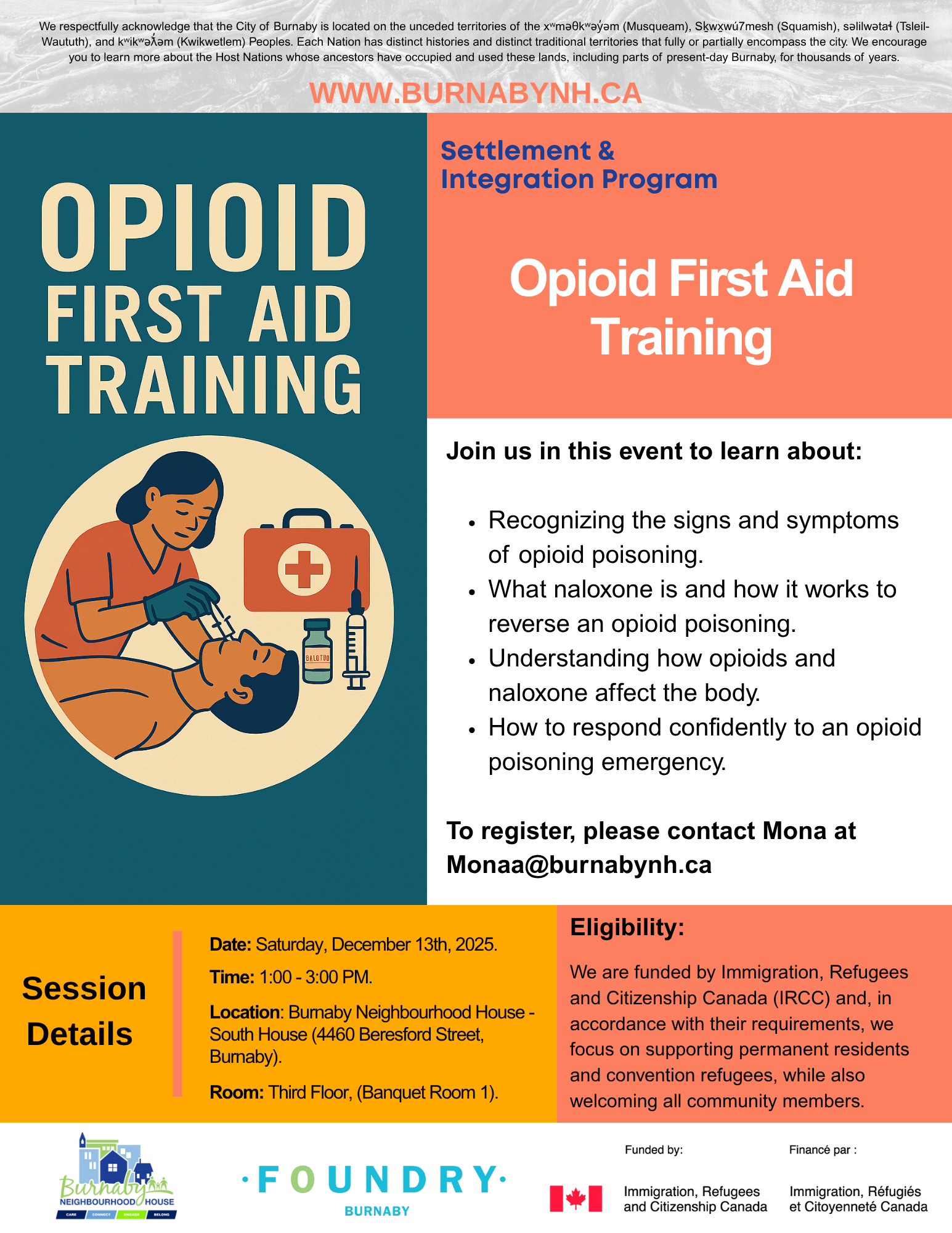 Have you participated in an opioid first aid training before? Join us to learn how to recognize the signs of opioid poisoning, understand how opioids and naloxone affect the body, learn what naloxone is and how it works, and how to respond to an opioid poisoning situation. The session will be held on Saturday, December 13, 2025, from 1:00–3:00 PM at BNH South House. Funded by IRCC, this program primarily supports permanent residents and convention refugees, while welcoming all community members.