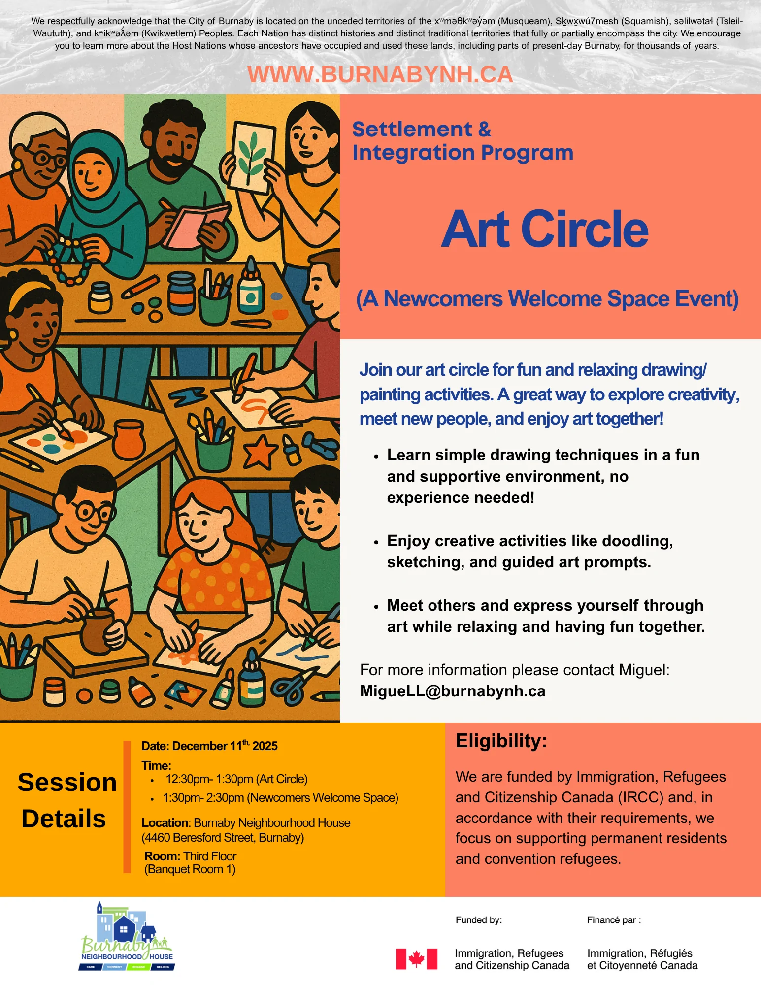 Join our Art Circle for a fun and relaxing drawing and painting session. Explore your creativity, meet new people, and enjoy art together. No experience is needed, learn simple drawing techniques in a supportive environment and try activities like doodling, sketching, and guided art prompts. Connect with others, express yourself, and have fun. The session will be held on December 11, 2025, at BNH South House from 12:30–1:30 PM, followed by the Newcomers Welcome Space from 1:30 PM to 2:30 PM.
