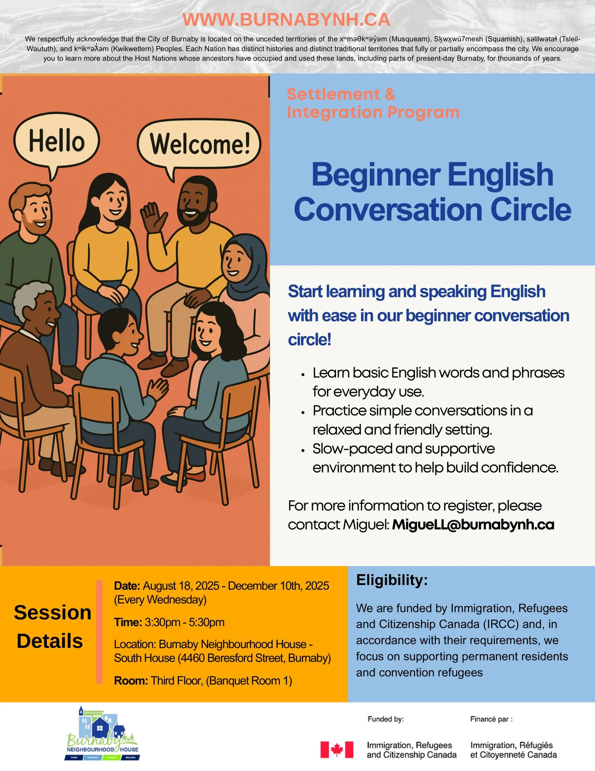 See attached poster for details. For more information, please contact Miguel: MigueLL@burnabynh.ca.