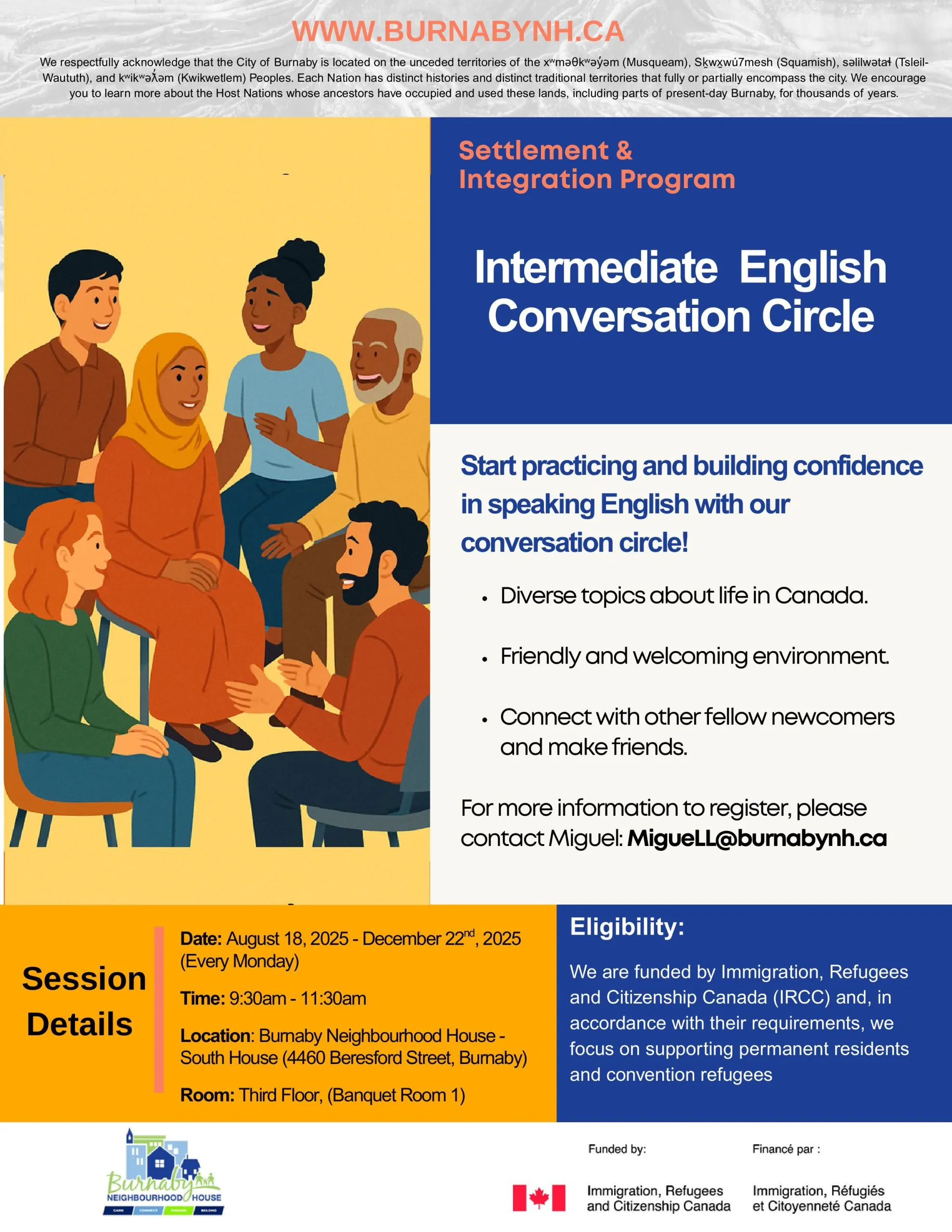 Engage in diverse topics about life in Canada, all in a friendly and welcoming environment. Connect with fellow newcomers and make new friends as you improve your language skills.