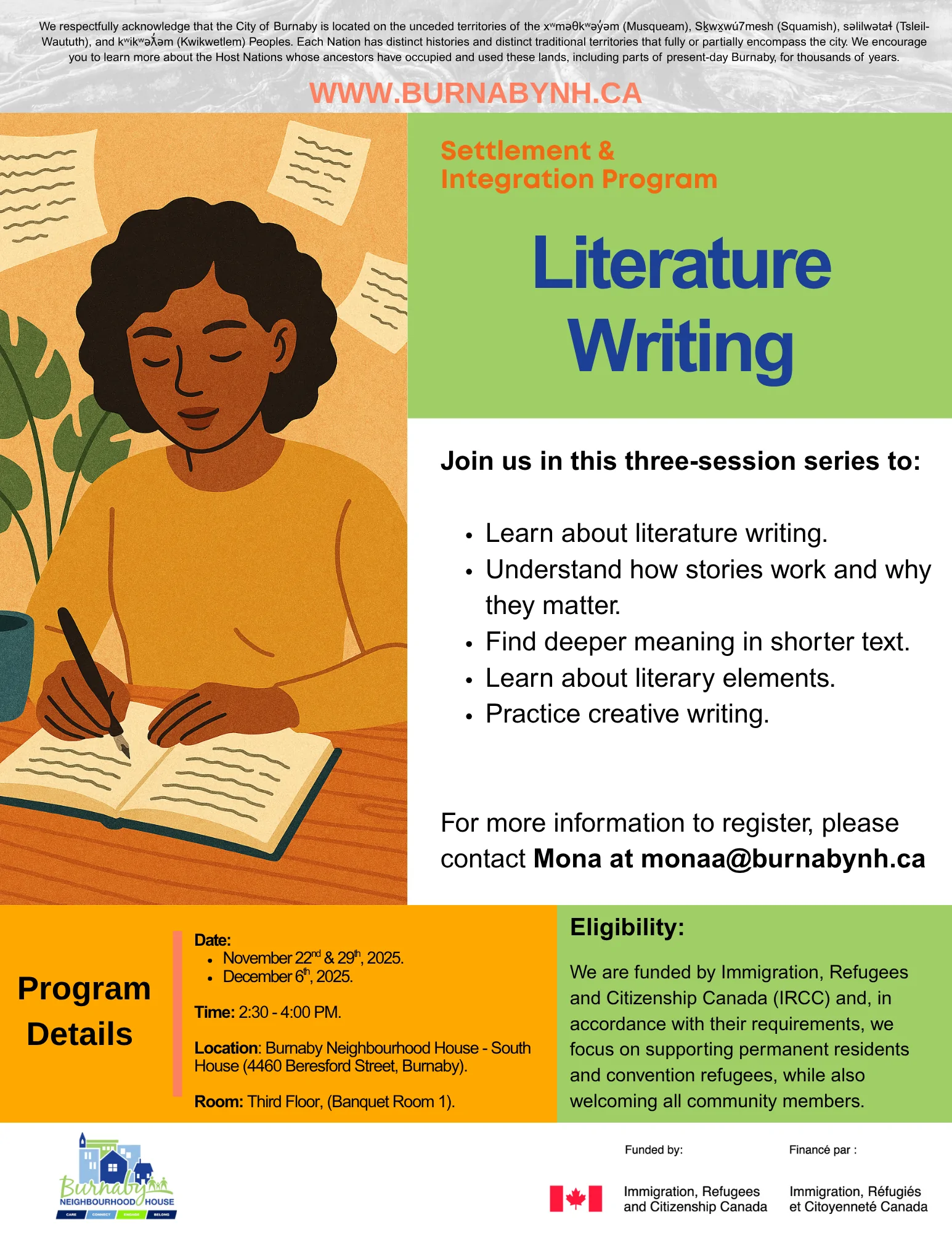Love writing? Join our free three-session literature writing series at BNH South House, where you’ll explore how stories work, understand key literary elements, analyze short texts, and practice creative writing. Sessions run Saturdays on November 22, 29, and December 6, 2025, from 2:30–4:00 PM. This program is funded by IRCC and is intended for permanent residents and convention refugees. For more information or to register, please contact Mona at monaa@burnabynh.ca.