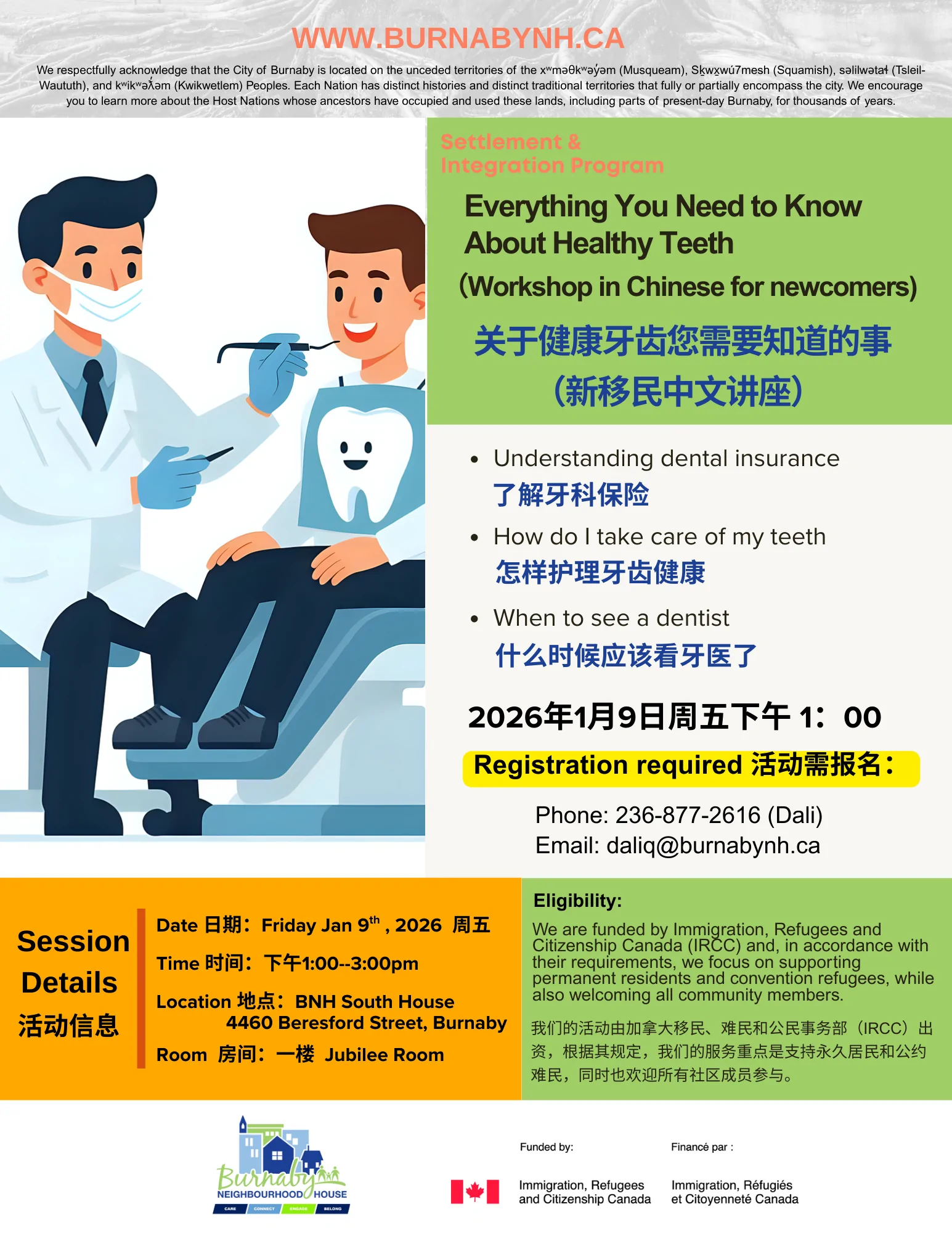 Everything You Need to Know About Healthy Teeth. Join us for a dental health workshop designed especially for the Chinese newcomer community. Learn how the Canadian dental system works, how to take care of your teeth, and when it is time to visit a dentist. The workshop will take place on January 9, 2026, from 1:00 PM to 3:00 PM at BNH South House.