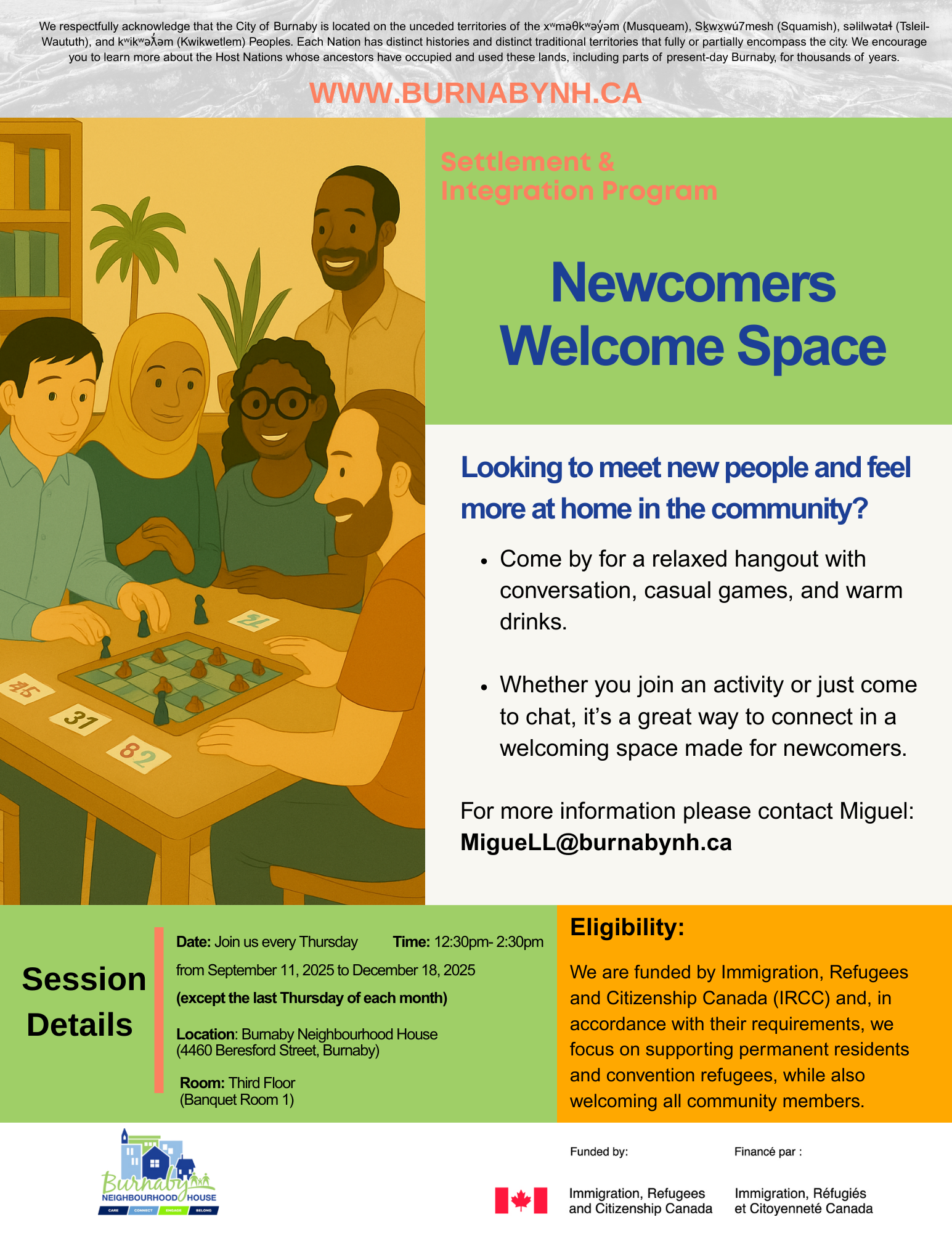 See attached poster for details. For more information, please contact Miguel: MigueLL@burnabynh.ca.