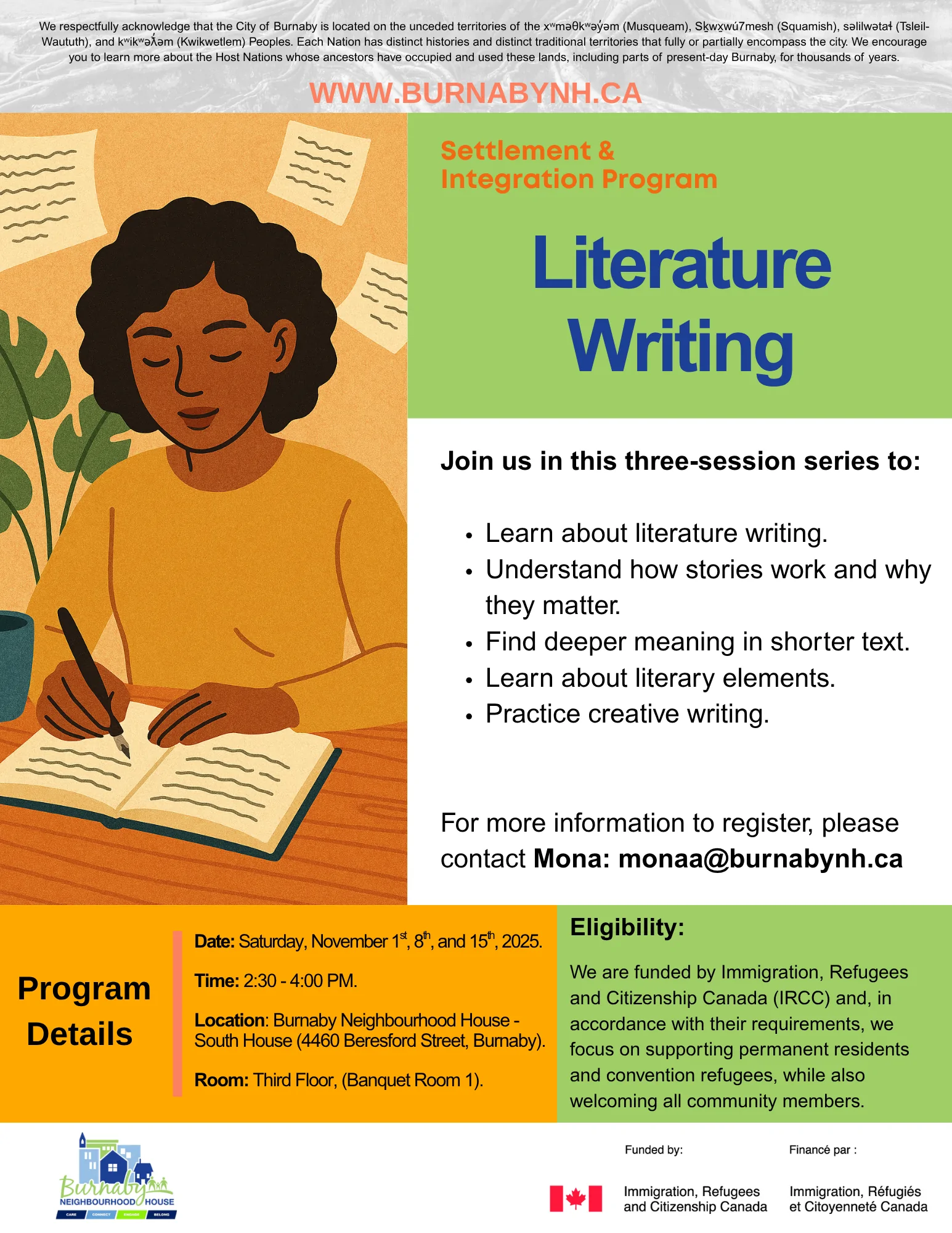 Love writing? Want to explore the elements and themes that bring stories to life? Join us for a free 3-session literature writing series at BNH South House on Saturdays, November 1st, 8th, and 15th, 2025 from 2:30 to 4:00 PM. You’ll discover the art of literature writing, learn how stories work, explore deeper meanings in short texts, and practice your creative writing skills. This program is funded by IRCC and is open to permanent residents and convention refugees.